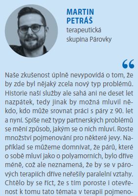 Pro časopis Statistika a My (04/2025), který vydává Český statistický úřad, píšu o tom, že zatímco typy partnerských problémů zůstávají v zásadě podobné (paralelní vztahy, komunikační bariéry), mění se způsob jejich artikulace a společenský kontext. Narůstá množství konkrétních pojmenování – například označení „polyamorní“ pro vztahy, které dříve existovaly bez explicitní terminologie, ale otevřenost k jejich diskusi v terapii roste pomaleji. Zároveň se posouvá vnímání psychoterapie jako běžného nástroje k dosažení duševní pohody: stále častěji k nám přicházejí páry, kde jeden nebo druhý již má zkušenosti s individuální terapií.