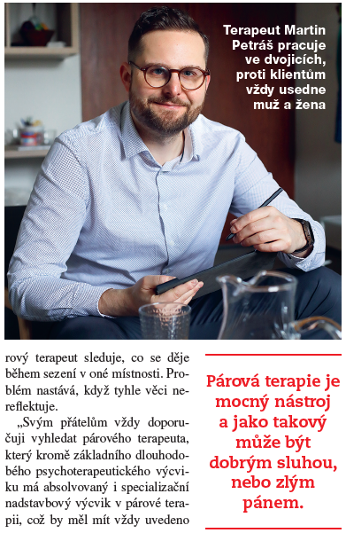 - „Z terapie jsem měl trochu strach, otevírat se cizímu člověku mi není blízké. S panem Martinem se ale ničeho bát nemusím. Sezení s ním jsou velice uvolněně, příjemné. Martin je citlivý, věcný i vtipný. Původní strach jsem měl skrz předešlé zkušenosti jinde, kdy terapeutka vypadala, že ji nudím nebo je k smrti unavená. U Martina cítím, že ho samotného baví přicházet na jádro pudla, že ho tím neotravuju.“